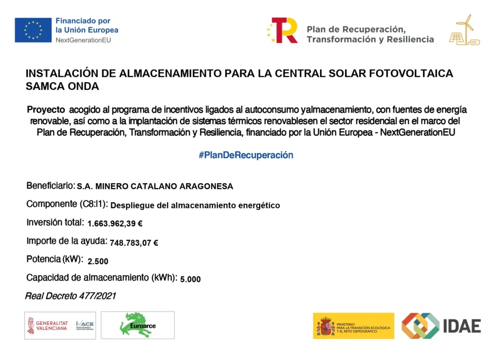 SOCIEDAD ANÓNIMA MINERA CATALANO ARAGONESA (SAMCA) ha recibido una ayuda de la Unión Europea con cargo al Fondo NextGenerationEU, en el marco del Plan de Recuperación, Trasformación y Resiliencia, para el proyecto CENTRAL SOLAR FOTOVOLTAICA SAMCA ONDA dentro del programa de incentivos ligados al autoconsumo y almacenamiento, con fuentes de energía renovable, así como la implantación de sistemas térmicos renovables en el sector residencial del Ministerio para la Transición Ecológica y el Reto Demográfico, gestionado por la Comunidad Valenciana, a través del Instituto Valenciano de Competitividad Empresarial (IVACE).